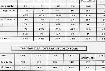 La CFE-CGC est nettement marquée à droite ainsi que la CFTC, 68% pour les listes de droite par les sympathisants CGC et 66% pour ceux de la CFTC. FO a l'électorat le plus diversifié mais aussi le plus extrême : un quart de ses sympathisants vote aux deux extrêmes.