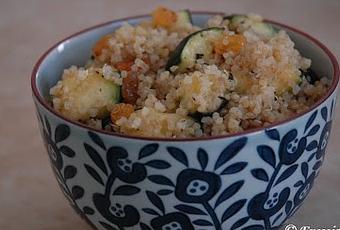 Couper la courgette en cubes, les faire revenir dans un filet d'huile, assaisonner avec les herbes de Provence, le sel et le poivre. Ajouter le quinoa cuit, les raisins secs, 2 cuillères à soupe d'eau et faire revenir quelques minutes.