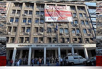 du Ministère du Travail dénonçant la nouvelle série de mesures anti-populaires du gouvernement, de l'UE et du FMI. Ils ont accroché une banderole sur la façade du bâtiment avec comme slogan