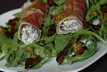 Mettre 1 quenelle de cette farce sur chaque tranche de jambon cru et rouler.