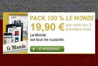 d’abonnement couplé. A signaler notamment l'offre d'essai du Monde (19,99€ pour la version papier/web/iPhone/iPad). Discussion pas plus tard qu'hier avec un lecteur de 65 ans (30 ans abonné au Monde et à l'Express entre autres) qui embarquait pour son week-end dans le train avec une pile de trois quotidiens, 2 magazines week-end et trois hebdos. Il me dit qu'il lit très peu sur le web, je lui parlais de changements dans sa pratique de lecture avec un hypothétique iPad. Faut voir me dit-il, l'oeil pétillant, ne préjugeons de rien... Trois mois pour apprécier sa propre lecture du journal et renouveler en choisissant quelle offre privilégier. Quand je me rappelle qu'à l'époque j'avais payé l'abonnement à la version ePaper (seule) des Echos 365€ pour l'année!