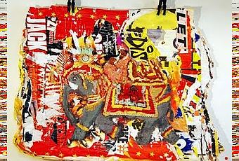 On le sait, l'Inde est source d'inspiration pour de nombreux artistes. Ainsi Alain Chabanier, non seulement peintre mais aussi adepte des collages qui a construit cette œuvre à partir d'affiches déchirées ou décollées de murs en Inde et agrémentées de peinture, de broderies...
