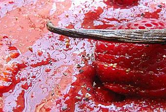 * Dans une casserole, faire un sirop avec l'eau, le jus de citron, le sirop de rose et la gousse de vanille fendue. Laissez frémir quelques minutes et ajoutez les fraises. Coupez le feu et laissez infuser une trentaines de minutes.