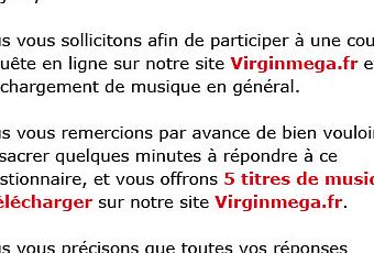 - Virginmega.fr propose aux destinataires de participer à une enquête pour savoir ce qu'ils pensent du site Virginmega.fr et du téléchargement de musique en général.