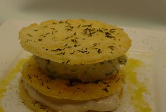 Au moment de servir, décoller délicatement les tuiles et monter le millefeuille en alternant une tuile, du fromage au piquillos, une autre tuile, le formage de chèvre au basilic et huile d'olive et enfin une dernière tuile.