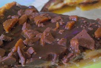 Mettre la crème dans une casserole, ajouter le chocolat et faire fondre en mélangeant constamment. Le mélange doit être bien lisse et homogène ; l’étaler sur la tarte refroidie et parsemer aves les éclats de Daim.