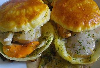 Ouvrir les feuilletés en deux, les disposer par moitié dans les assiettes, répartir les poireaux autour puis mettre une noix de St Jacques sur chacun des feuilletés. Les recouvrir avec la deuxième moitié de feuilleté.