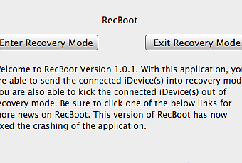 Un développeur a réussi à créer un logiciel très simple pour le faire à votre place. Il n’y a que deux boutons dans la fenêtre. Le premier permet de passer l’iBidule en Recovery Mode (Enter Recovery Mode), le deuxième vous permet au contraire d’en sortir (Exit Recovery Mode).