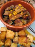 Egouttez la viande et faites réduire le jus de cuisson jusqu'à ce qu'il soit très court. Remettre la viande dans la cocotte, ajoutez le jus d'orange et le sucre. Laissez cuire jusqu'à l'obtention d'un jus court et parfumé. Retirez du feu.