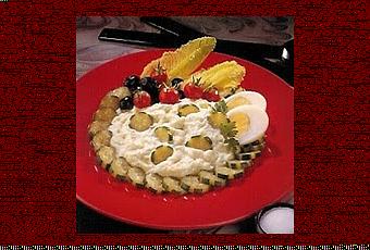 - Mettre cette préparation dans un plat creux, l'entourer de rondelles de courgettes. Décorer des œufs, des olives dénoyautées et des tomates cerises. Garder 1 h au frais avant de servir.