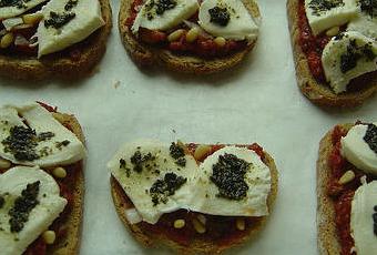 3° Déposez quelques lamelles d'oignon. Déposez 2 tranches de mozzarella sur les tartines.Terminez par les pignons et apposez une touche de pistou ou tapenade sur la mozzarella.
