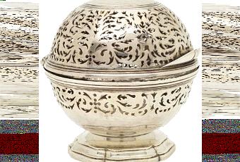 blanche de Saint-Cloud. Il en existe en d'autres matières : comme en argent. La boule à éponge a la même forme mais est ajourée. Pierre Bergé & Associés en expose une dans le