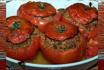 Déposer la viande dans les tomates. Remettre les chapeaux des tomates. Mettre un un peu d’eau au fond du plat.