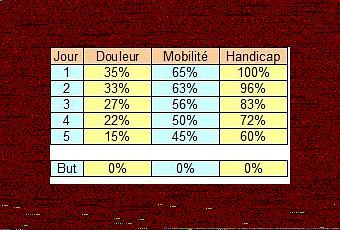 Le problème est que les paramètres évoluent constamment à différents rythmes et qu'il est très difficile de bien saisir le résultat réel. Comme ce mal implique la variabilité de la douleur et la mobilité, ces deux éléments ajoutés définissent mon expérience réelle, qui le premier jour se montait a quelque chose de 100% déplaisant, alors qu'un rétablissement complet devrait ramener cette même valeur à zéro. Dans cet esprit, j'ai généré un premier tableau qui vous permettra de juger de mes progrès après seulement cinq jours de galère. Une mise à jour accompagnée de quelques commentaires philosophiques sera disponibles des que j'aurai atteint le nirvana physique. Promis!