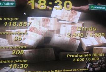Ainsi il reste actuellement 35 joueurs sur 4 tables alors que 53 joueurs étaient au départ de ce Day2. A 15 minutes de l’augmentation des blindes La moyenne est passée à plus de 118.000. En résumé nous avons perdu près de 40% des joueurs!