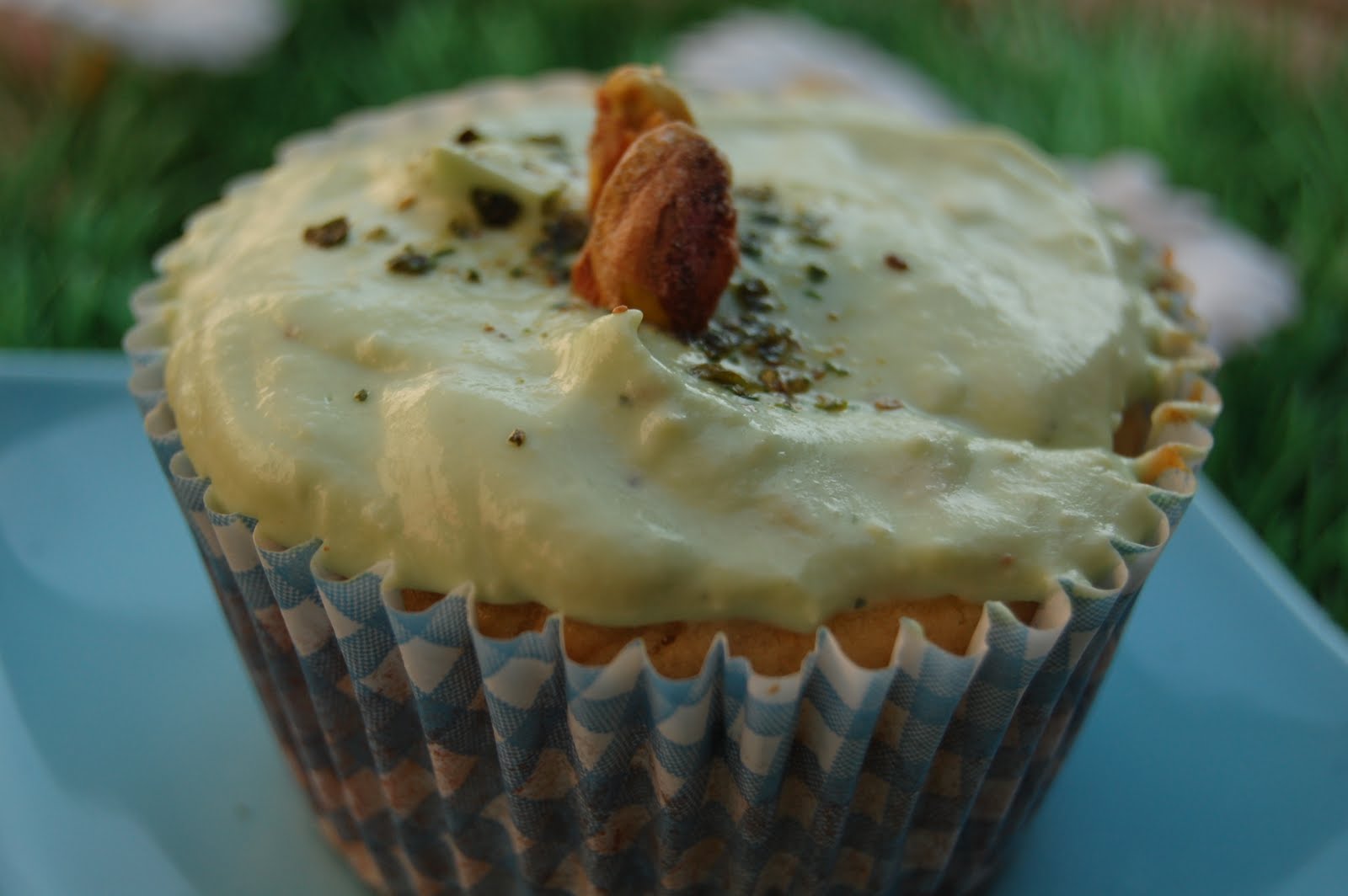 Pour Le topping, c'est simple il suffit de mélanger au fouet tout les ingrédients sauf les épices saveurs du sud et les pistaches que l'on garde pour décorer le dessus. Après, on garnit généreusement le dessus de chaque cupcake avec cette crème verte. Toujours avec un doigt ( bien propre), c'est ce que je préfère! avec une douille, avec une petite cuillère...