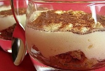 Dans un cul de poule, fouetter le jaune d'oeuf avec le sucre et le mascarpone puis incorporer délicatement les blancs en neige. Répartir dans les verrines sur les mini-cakes et placer au