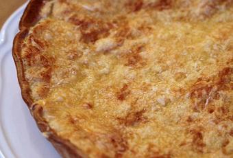 Disposez la pâte brisée dans un moule à tarte, piquez le fond avec une fourchette et versez toute la purée en égalisant bien le dessus. Saupoudrez avec le compté et enfournez pour environ 30 minutes de cuisson.