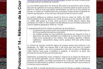 - Sur le protocole n° 14, V. une brève synthèse de ses apports et perspectives et Actualités Droits-Libertés du 15 janvier 2010 (2) ; Sur l’activité de la Cour, V. Actualité Droits-Libertés du 29 janvier 2010).