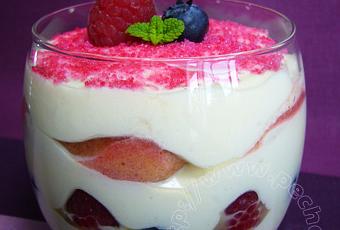 Montage : Placez 3 moitiés de biscuits au fond du verre, recouvrez d’une couche de crème. Faites ensuite un couche de fruits, framboises, myrtilles, recouvrez d’une fine couche de crème, puis de 3 biscuits et terminer de crème. Gardez des fruits pour la présentation. Mettez les verres au moins 2 heures au réfrigérateur pour que les parfums se mélangent.
