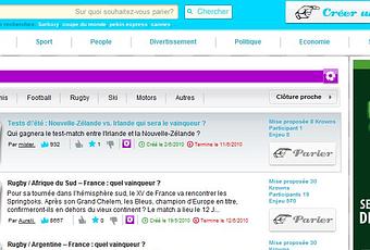 Le Blogue de Mister Rugby partenaire de BetKlub. BetKlub est un site qui permet de parier sur une monnaie virtuelle avec vos amis ou d’autres internautes. Vous pouvez y faire des paris sur le rugby (Top 14, tests internationaux, 6 Nations, etc.) mais aussi sur plein d’autres choses (Foot, tennis, F1, la politique ou sur les émissions de téléréalité ! En tant que partenaire du BetKlub je pourrais être amené à donner de précieux conseils d « expert » aux parieurs novices en rugby. Le plus amusant c’est qu’avec BetKlub vous pouvez vous-même créer vos propres paris et les faire partager avec vos contacts sur des plateformes de réseaux sociaux telles que Facebook ou Twitter.