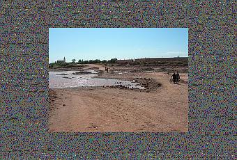 Des ouvrages endommagés sont encore inutilisables. C'est le cas au nord d'Ouled Teima. L'oued Issen qui débouche de l'Atlas et s'y jette dans le Souss avait emporté le pont qui mène au douar Fayda (à gauche). Comme on le constate, à mi-avril, le bassin de l'oued était encore plein d'eau (au centre), ce qui est totalement inhabituel. Les voitures et les camions ne peuvent pas utiliser la digue provisoire qui a été installée. Seuls les piétons ne sont guère incommodés par les conséquences des éléments déchaînés...