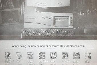 Effectivement, sur cette publicité, on peut voir juste à côté de Window98 (si si !) l’ancêtre d’Oxatis « e-Biz-in-a-Box » un des dix premiers softs à être commercialisé par Amazon !