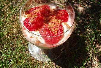 Dresser vos verrines : une couche de spéculoos, une couche de fromage blanc, une couche de fraises, une couche de fromage blanc, une couche de fraises, et saupoudrer de spéculoos.
