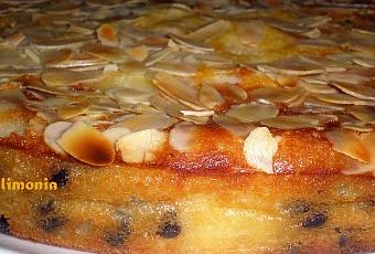 Distribuir a ese momento las almendras en la superficie y seguir horneando 15/20mn mas. Verificar la coccion con una aguja, si sale limpia y seca, se puede sacar el pastel del horno.
