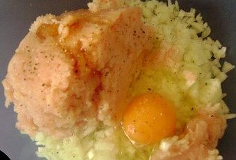 1) Mixer le poulet, ajouter l'oeuf, le miel, du sel, du poivre et un peu de chapelure.