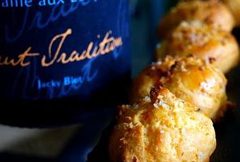 On démarre avec un Brut Tradition de Jacky Blot (Montlouis, chenin) qu'a amené Jean-François. Il accompagne des gougères à la mimolette extra-vielle & noisettes grillées. Un robe jaune pâle finement pétillante. Un nez minéral sur la coquille d'huître et l'ardoise mouillée. Une bouche ronde et fraîche, avec des bulles picotantes qui agacent agréablement la langue, et une amertume typique du cépage qui va crescendo, associée à une légère astringence en finale. Au vu d'expériences passées avec cette cuvée, plutôt une bonne surprise.