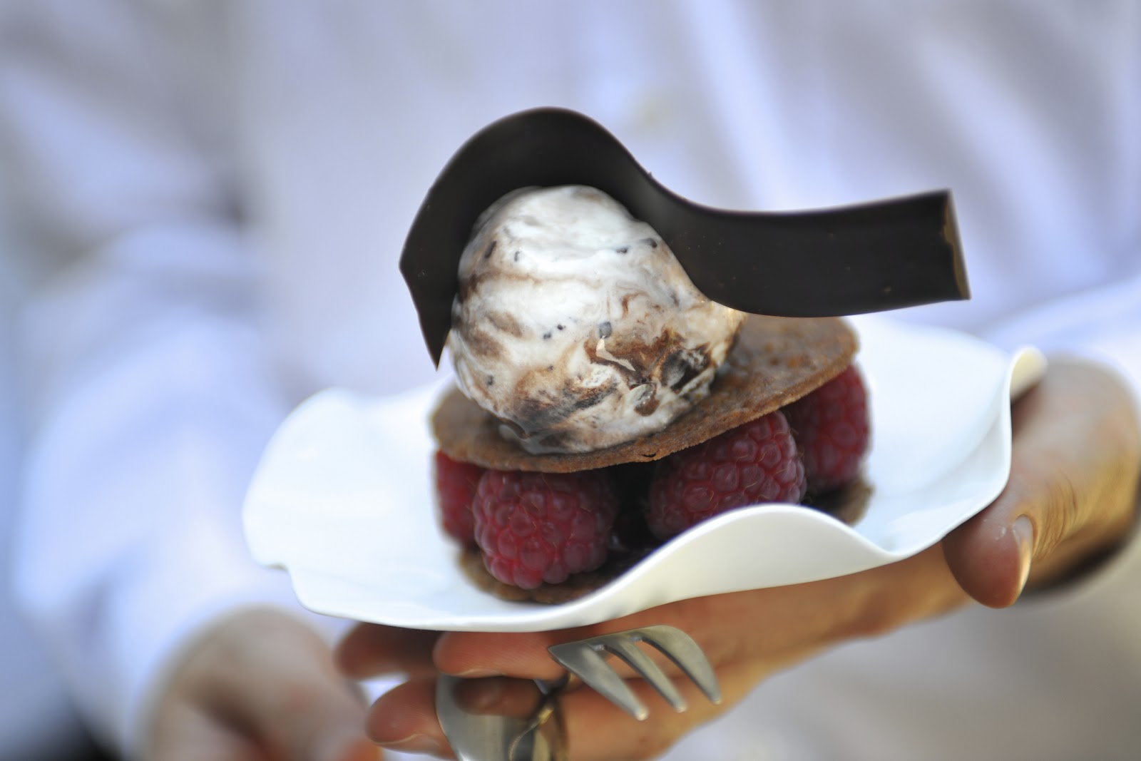Montage et PrésentationDans le fond d’une assiette, déposez un biscuit spéculoos. Sur celui-ci, dressez une couche d’1/2 cm de confiture de framboises. Décorez ensuite de framboises fraîches entières. Par-dessus les framboises, mettez un second biscuit spéculoos. Terminez par une quenelle de glace Stracciatella de Carte d’Or. Décorez d’une framboise fraîche et de quelques boucles en chocolat. Entourez le tout d’un cordon de sauce au Cacao.