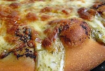 Cette pizza est dite blanche car on n'y ajoute pas de sauce tomate. Je ne prétends pas détenir la recette traditionnelle, j'ai juste improvisé une garniture au pesto et aux fromages sur une pâte bien épaisse et moelleuse. J'ai pris la recette de pâte sur le blog "RDV aux mignardises" et là je suis tombée sur un petit bijou! Cette pâte est tout simplement extra!... même si je n'ai pas suivi à la lettre les étapes de sa fabrication. La levure chimique et l'eau gazeuse qu'elle contient la rendent ultra moelleuse.