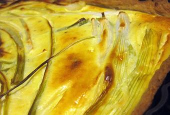 Remplir le fond de tarte avec cette appareil et poser les oignons émincés tête-bêche sur la surface de l'appareil à tarte.