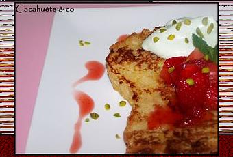 Ingrédients : 4 tranches épaisses de brioche (maison pour moi !!!) - 200 g de fraises - 1/2 L de lait d'amande - 2 oeufs - 50 g de sucre - 2 cuillère à soupe de miel - 60 g de mascarpone - 10 cl de crème liquide - 1 cuillère à café de pâte de pistache - 1 cuiillère à soupe de sucre glace - 15 g de beurre