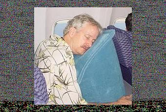 Le SkyRest travel pillow, de quoi voyager léger et en toute discrétion. Notez aussi la jolie chemisette tropicale du mannequin d’un jour.