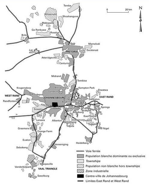 L'espace bâti à Johannesburg.Philippe Gervais-Lambony, 2003, Territoires citadins. Quatre villes africaines,Paris, Belin, coll.Mappemonde.