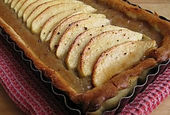 A la sortie du four, badigeonner la tarte (pommes et croûte) avec de la gelée de coing tiédie au micro-ondes.