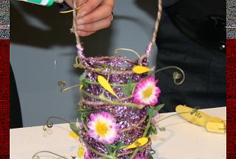 par créer le panier en utilisant un fil de laiton (marque oasis). elle tresse le fil de fer qui donne la forme finale. La poignée est