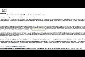 La Commission mondiale sur la dimension sociale de la mondialisation a été instituée par l'Organisation internationale du Travail (OIT)[°0] en février 2002. Il s'agit d'un organe indépendant qui a été créé pour répondre aux besoins de tous ceux qui doivent faire face aux changements sans précédent que la mondialisation a introduits dans leur vie et dans celle de leurs familles ainsi que dans la société.Leur rapport "Une Mondialisation juste : Créer des opportunités pour tous", de cette Commission a même été présenté le 7 juillet à l’UNESCO[°0] !!!