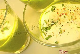 * Répartir l'elixir vert dans de petits verres et déposer sur le dessus une cuillère de mousse de mascarpone. Un dernier tour de moulin à poivre et décorer avec un peu de tiges d'oignons nouveaux ciselées ou quelques lanières d'oignons finement ciselées.