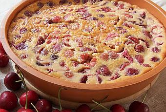 Battre les oeufs en omelette, ajouter les sucres et le sel, puis le beurre fondu et la farine. Délayer avec le lait. Verser sur les cerises et enfourner 35 minutes à 180°C (un peu moins pour un four à gaz).
