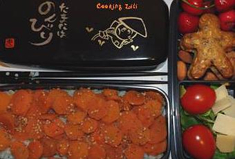 En bas : du riz du sushi vinaigré avec du sésame au wasabi et des carottes vapeur à la sauce soja, assaisonnement au riz complet et gomasio. J’ai d’ailleurs eu les yeux plus gros que le ventre, j’ai mangé ça en deux fois ^^