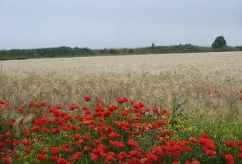 De nouveau tout paraît comme avant, pourtant dans mon souvenir le coquelicot n'était jamais loin du bleuet, centaurée à fleurs bleues que certains appellent aussi aubifoin, or ce bleuet manque dans le décor reconstitué. Que sont les bleuets devenus ?