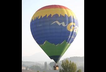 Au petit matin, une montgolfière traverse tranquillement le ciel de Roumoules dans les Gorges du Verdon.