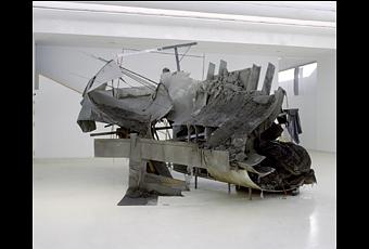 A côté de la collection de coiffes, La Maison Rouge offre aussi (jusqu’au 26 septembre) la fresque de dessins quotidiens obsessionnels de Jean de Maximy, frise linéaire, oeuvre à l’échelle d’une vie, à la Kawara ou Opalka, dont les formes endoscopiques ne sont que la surface des choses. Mais surtout il faut voir les sculptures poussiéreuses de Peter Buggenhout, pièces gigantesques, indéfinissables, monstrueuses, informes dans lesquelles on voudrait entrer, grimper, se lover, ressortir sale. Cette accumulation de déchets, de pièces récupérées dans des décharges ou des chantiers est comme le témoin d’une destruction, d’un cataclysme, d’un échouage. Tout en bas, les pièces à base de tripes bovines puent un peu, blanchâtres, répugnantes, elles n’offrent pas la fascination d’une Berlinde de Bruyckhere. Mieux vaut rester dans le métal et la poussière.