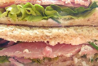 Sur une tranche, recouvrez de feuilles de salade, puis recouvrez de jambon blanc dégraissé. Recouvrez d'une seconde tranche.