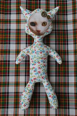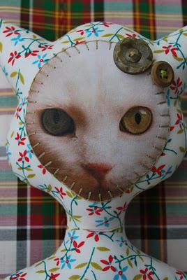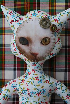 Ma nouvelle minette branchée est habillée d'un tissu fleuri qui vient d'une petite fabrique artisanale indienne. Cette créature est parée de deux boutons chinés dans un vide grenier.Les Poupées Laïs de violette lavilaine (it's me!) sont de chats jolis à accrocher au mur comme un tableau. Ces pièces de créateur mesurent en moyenne 33 cm et pèsent environ 100 grammes. Elles sont fabriquées à la main en toutes petites séries (de une à huit poupée(s) selon le tissu).