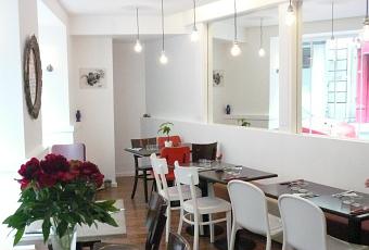 Ce sont deux charmants jeunes hommes : Kostia et Aurélien, qui sont à la tête de ce nouveau restaurant de la rue Rodier, ouvert depuis février 2010. Les 2 garçons ont refait les 37 mètres carrés du restaurant à neuf. La décoration est élégante. Le moindre détail a été pensé avec goût comme les fauteuils de cinéma dénichés aux puces ou encore ces suspensions très modernes. Original le cadre comportant le menu écrit à l’envers ! Pour déchiffrer la liste des douceurs, il faut regarder dans la glace en face.