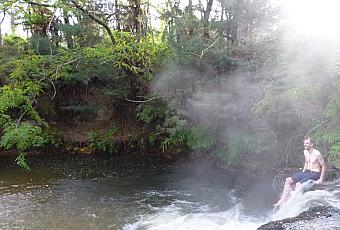 Thermes sauvages entre Rotorua et Taupo: la source d'eau bouillante réchauffe le torrent d'eau froide, donnant la température idéale pour la baignade (une quarantaine de degrés). Quoique... c'est encore un peu trop chaud pour moi.